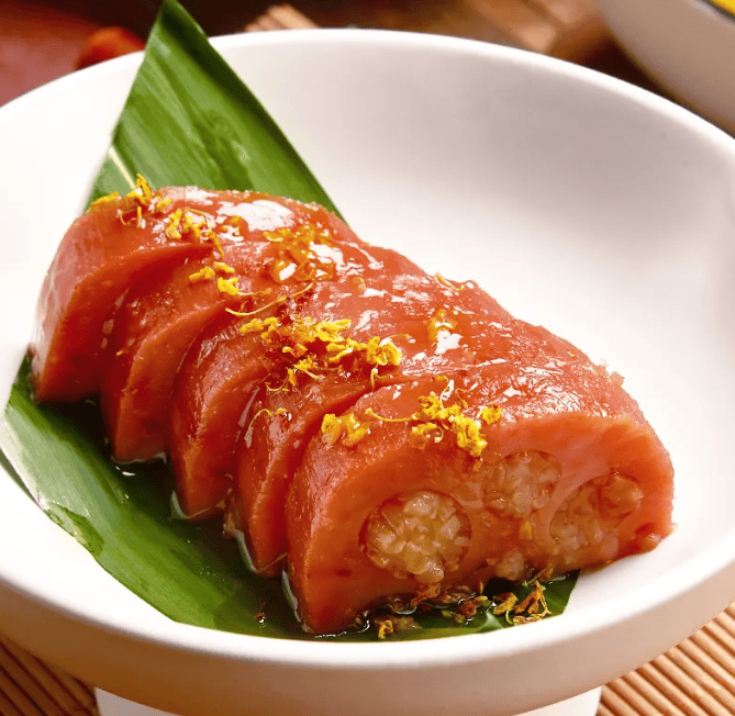 生糯米灌在莲藕中,配以桂花酱,是江南地区传统菜式中一道独具特色的中式甜品,以其甜糯、桂花香气浓郁而享有口碑,桂花蜜汁藕和桂花糖芋苗、梅花糕、赤豆酒酿小圆子一同